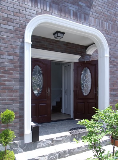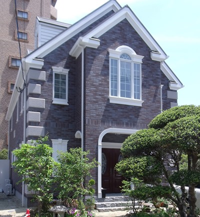 206の外壁に140ミリ厚のグラスウール断熱材を詰めた暖かい構造体に濃い焼きすぎレンガタイルを乾式工法で貼り、玄関入口や窓廻り等開口部はファイポン社の化粧モールドでアクセントをつけてあります。