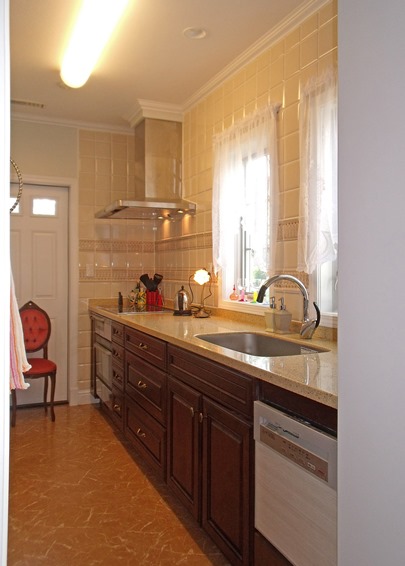 クラフトメイド社のシステムキッチン。パナソニックの食洗機、アリアフィーナの換気扇、TOTOの混合栓。壁タイル アドヴァン 床 東リ ホモジニアスタイル。