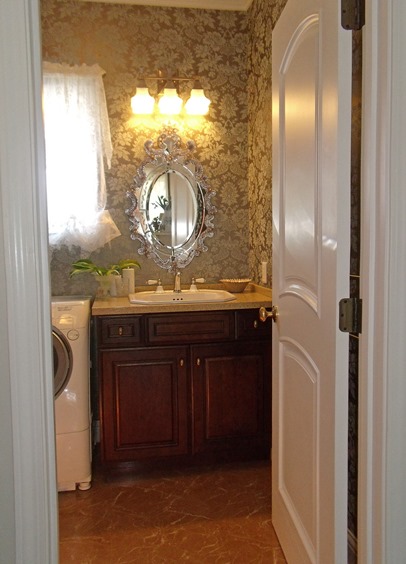 洗面台 クラフトメイド社 カウンター 大理石 壁 テシード社ウォールペーパー 床 大理石調ホモジニアルタイル