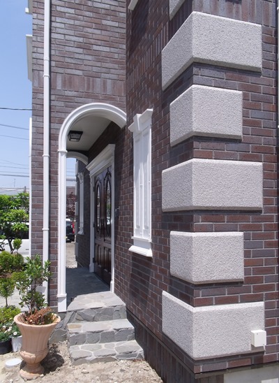建物の角はレンガの単調さをカバーするため、カーソン社のクォーツストーンを取り付け、御影石調に吹付ました。タイルの幅と石の間隔も予め計算して割り付けされています。