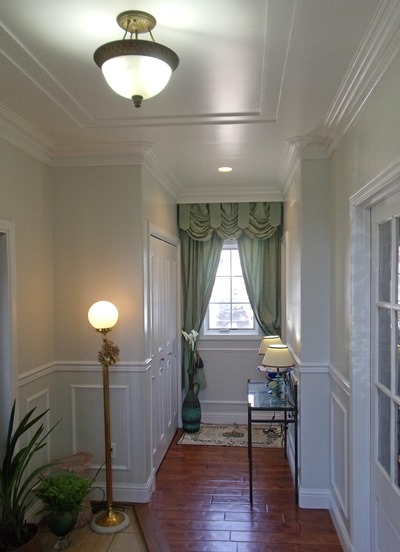 天井に浅い2段の段差、その下に幅広の天井廻縁を取り付け、表情を豊かにしています。また、壁は腰回りにチェアレール、その下にパネルモールドで、装飾しました。天井・壁共AEP仕上。