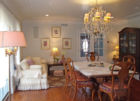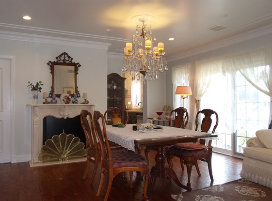玄関ホールのガラス扉を開くと17.4畳のリビング・ダイニングルーム。O様お気に入りのドレクセルのダイニングセット、リビングソファー、シャンデリアがセットされています。